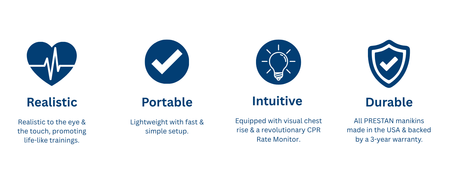 The PRESTAN Professional Product Line is engineered for true-to-life CPR training that mirrors real-world conditions. With realistic skin feel, visual chest rise, and PRESTAN’s revolutionary CPR Rate Monitor, instructors and students receive instant, actionable feedback on rate and depth—ensuring high-quality performance every time. Lightweight, durable, and simple to set up, these manikins streamline training for classrooms, community programs, and professional environments.